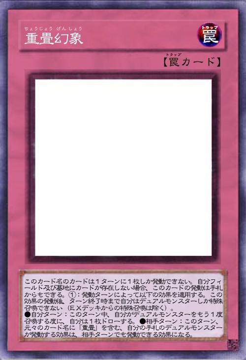 | このカード名のカードは1ターンに1枚しか発動できない。自分フィールド及び墓地にカードが存在しない場合、このカードの発動は手札からもできる。①:発動ターンによって以下の効果を適用する。この効果の発動後、ターン終了時まで自分はデュアルモンスターしか特殊召喚できない(EXデッキからの特殊召喚は除く)。 ●自分ターン:このターン中、自分がデュアルモンスターをもう1度召喚する度に、自分は1枚ドローする。●相手ターン:このターン、元々のカード名に「重畳」を含む、自分の手札のデュアルモンスターが発動する効果は、相手ターンでも発動できる効果になる。 | |||