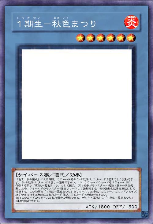 | 「色まつりの儀式」により降臨。このカード名の(2)の効果は、1ターンに2度までしか発動できず、(3)の効果は1ターンに1度しか発動できない。(1):このカードのカード名はフィールドに存在する限り「1期生-夏色まつり」として扱う。(2):相手がモンスター・魔法・罠カードを発動した時、フィールドのモンスター1体をリリースして発動できる。その発動と効果を無効にして破壊する。この効果で「1期生-夏色まつり」をリリースした場合、このターンのエンドフェイズ終了時まで相手は無効にされたカード及び、同名カードの発動ができない。 (3):このカードがリリースされた場合に発動できる。デッキ・墓地から「1期生-夏色まつり」1体を特殊召喚する。 | |||
