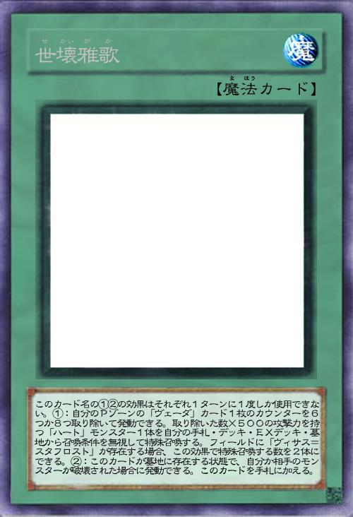 | このカード名の①②の効果はそれぞれ1ターンに1度しか使用できない。①:自分のPゾーンの「ヴェーダ」カード1枚のカウンターを6つか8つ取り除いて発動できる。取り除いた数×500の攻撃力を持つ「ハート」モンスター1体を自分の手札・デッキ・EXデッキ・墓地から召喚条件を無視して特殊召喚する。フィールドに「ヴィサス=スタフロスト」が存在する場合、この効果で特殊召喚する数を2体にできる。②:このカードが墓地に存在する状態で、自分か相手のモンスターが破壊された場合に発動できる。このカードを手札に加える。 | |||
