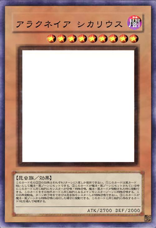 | このカード名の②③の効果はそれぞれ1ターンに1度しか使用できない。①このカードは罠カード扱いとして魔法・罠ゾーンにセットできる。②このカードが魔法・罠ゾーンにセットされている時にこのカードと同じ縦列にモンスターが召喚・特殊召喚、魔法・罠カードが発動された時に発動できる。このカードをその相手カードと同じ縦列となるメインモンスターゾーンに特殊召喚する。この効果発動後、ターン終了時まで自分は昆虫族モンスターしか特殊召喚できない。③このカードが魔法・罠ゾーンから特殊召喚に成功した場合に発動できる。このカードと同じ縦列に存在するカード1枚を選んで破壊する。 | |||