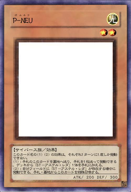 | このカード名の(1)(2)の効果は、それぞれ1ターンに1度しか発動できない。 (1):手札のこのカードを墓地へ送り、手札を1枚送って発動できる。デッキから「ST-アステル・レダ」1体を手札に加える。 (2):自分フィールドに「ST-アステル・レダ」が存在する場合に発動できる。手札・墓地からこのカードを特殊召喚する。 | |||
