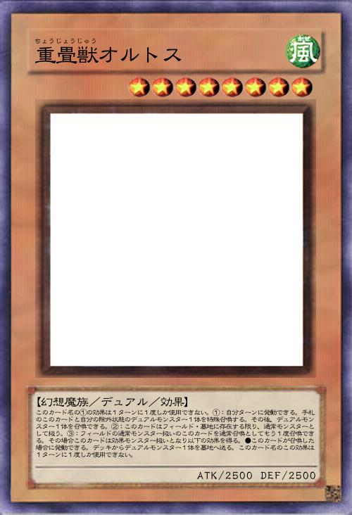 | このカード名の①の効果は1ターンに1度しか使用できない。①:自分ターンに発動できる。手札のこのカードと自分の除外状態のデュアルモンスター1体を特殊召喚する。その後、デュアルモンスター1体を召喚できる。②:このカードはフィールド・墓地に存在する限り、通常モンスターとして扱う。③:フィールドの通常モンスター扱いのこのカードを通常召喚としてもう1度召喚できる。その場合このカードは効果モンスター扱いとなり以下の効果を得る。●このカードが召喚した場合に発動できる。デッキからデュアルモンスター1体を墓地へ送る。このカード名のこの効果は1ターンに1度しか使用できない。 | |||