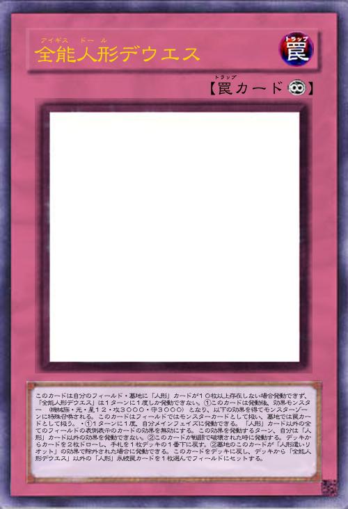 | このカードは自分のフィールド・墓地に「人形」カードが10枚以上存在しない場合発動できない。①このカードは発動後、効果モンスター (機械族・光・星12・攻3000・守3000)となり、以下の効果を得てモンスターゾーンに特殊召喚される。このカードはフィールドではモンスターカードとして扱い、墓地では罠カードとして扱う。・①1ターンに1度、自分メインフェイズに発動できる。「人形」カード以外の全てのフィールドの表側表示のカードの効果を無効にする。この効果を発動するターン、自分は「人形」カード以外の効果を発動できない。②このカードが戦闘で破壊された時に発動する。デッキからカードを2枚ドローし、手札を1枚デッキの1番下に戻す。②墓地のこのカードが「人形遣いリオット」の効果で除外された場合に発動できる。このカードをデッキに戻し、デッキから「全能人形デウエス」以外の「人形」永続罠カードを1枚選んでフィールドにセットする。 | |||