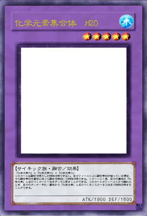 「化学元素H」+「化学元素H」+「化学元素O」 このカードは融合召喚でしか特殊召喚できない。自分フィールド上に融合素材が揃っている場合、その融合素材を墓地に送って融合召喚扱いで特殊召喚できる。1ターンに1度、自分の墓地の「化学元素」と名のつくカード1枚をデッキに戻すことができる。このカードがフィールドから離れたとき、自分のデッキ・手札・墓地から「化学元素」と名のつくモンスターを2体まで特殊召喚することができる。 |