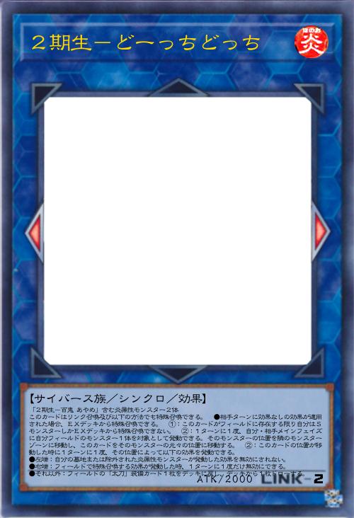 | 「2期生-百鬼 あやめ」含む炎属性モンスター2体 このカードはリンク召喚及び以下の方法でも特殊召喚できる。 ●相手ターンに効果なしの効果が適用された場合、EXデッキから特殊召喚できる。 ①:このカードがフィールドに存在する限り自分はSモンスターしかEXデッキから特殊召喚できない。 ②:1ターンに1度、自分・相手メインフェイズに自分フィールドのモンスター1体を対象として発動できる。そのモンスターの位置を隣のモンスターゾーンに移動し、このカードをそのモンスターの元々の位置に移動する。 ②:このカードの位置が移動した時に1ターンに1度、その位置によって以下の効果を発動できる。 ●左端:自分の墓地または除外された炎属性モンスターが発動した効果を無効にされない。 ●右端:フィールドで特殊召喚する効果が発動した時、1ターンに1度だけ無効にできる。 ●それ以外:フィールドの「太刀」装備カード1枚をデッキに戻し、デッキから1枚ドローする。 | |||