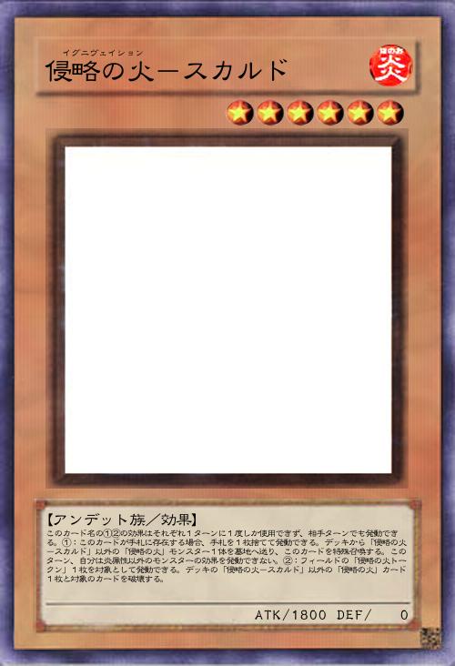 | このカード名の①②の効果はそれぞれ1ターンに1度しか使用できず、相手ターンでも発動でき る。①:このカードが手札に存在する場合、手札を1枚捨てて発動できる。デッキから「侵略の火-スカルド」以外の「侵略の火」モンスター1体を墓地へ送り、このカードを特殊召喚する。このターン、自分は炎属性以外のモンスターの効果を発動できない。②:フィールドの「侵略の火トークン」1枚を対象として発動できる。デッキの「侵略の火-スカルド」以外の「侵略の火」カード1枚と対象のカードを破壊する。 | |||