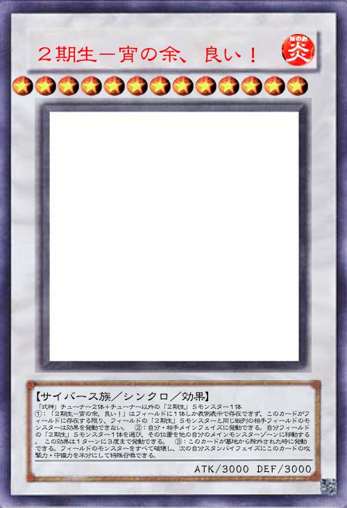 | 「式神」チューナー2体+チューナー以外の「2期生」Sモンスター1体 ①:「2期生-宵の余、良い!」はフィールドに1体しか表側表示で存在できず、このカードがフィールドに存在する限り、フィールドの「2期生」Sモンスターと同じ縦列の相手フィールドのモンスターは効果を発動できない。 ②:自分・相手メインフェイズに発動できる。自分フィールドの「2期生」Sモンスター1体を選び、その位置を他の自分のメインモンスターゾーンに移動する。 この効果は1ターンに3度まで発動できる。 ③:このカードが墓地から除外された時に発動できる。フィールドのモンスターをすべて破壊し、次の自分スタンバイフェイズにこのカードの攻撃力・守備力を半分にして特殊召喚できる。 | |||