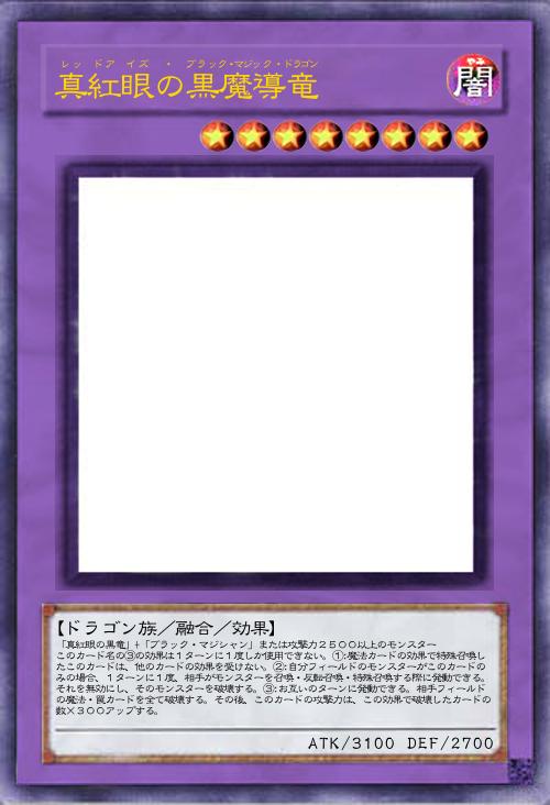 | 「真紅眼の黒竜」+「ブラック・マジシャン」または攻撃力2500以上のモンスター このカード名の③の効果は1ターンに1度しか使用できない。①:魔法カードの効果で特殊召喚したこのカードは、他のカードの効果を受けない。②:自分フィールドのモンスターがこのカードのみの場合、1ターンに1度、相手がモンスターを召喚・反転召喚・特殊召喚する際に発動できる。それを無効にし、そのモンスターを破壊する。③:お互いのターンに発動できる。相手フィールドの魔法・罠カードを全て破壊する。その後、このカードの攻撃力は、この効果で破壊したカードの数×300アップする。 | |||