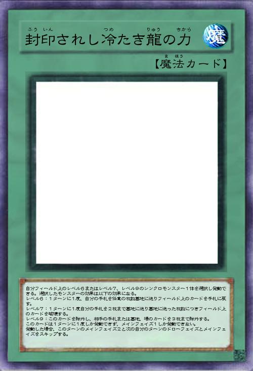 自分フィールド上のレベル6またはレベル7、レベル9のシンクロモンスター1体を選択し発動できる。選択したモンスターの効果は以下の効果になる。 レベル6:1ターンに1度、自分の手札を任意の枚数墓地に送りフィールド上のカードを手札に戻す。 レベル7:1ターンに1度自分の手札を2枚まで墓地に送り墓地に送った枚数につきフィールド上のカードを破壊する。 レベル9:このカードを除外し、相手の手札または墓地、場のカードを3枚まで除外する。 このカードは1ターンに1度しか発動できず、メインフェイズ1しか発動できない。 発動した場合、このターンのメインフェイズ2と次の自分のターンのドローフェイズとメインフェイズをスキップする。 |