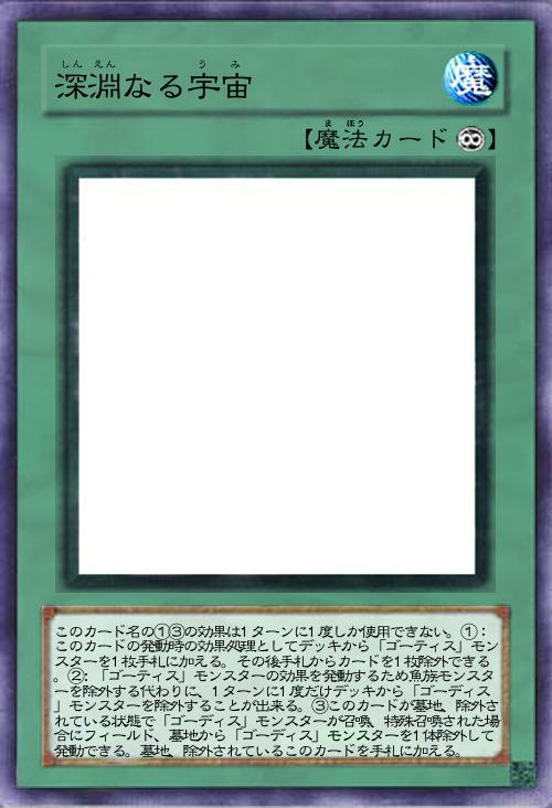 | このカード名の①③の効果は1ターンに1度しか使用できない。①:このカードの発動時の効果処理としてデッキから「ゴーティス」モンスターを1枚手札に加える。その後手札からカードを1枚除外できる。②:「ゴーティス」モンスターの効果を発動するため魚族モンスターを除外する代わりに、1ターンに1度だけデッキから「ゴーディス」モンスターを除外することが出来る。③このカードが墓地、除外されている状態で「ゴーディス」モンスターが召喚、特殊召喚された場合にフィールド、墓地から「ゴーディス」モンスターを1体除外して発動できる。墓地、除外されているこのカードを手札に加える。 | |||