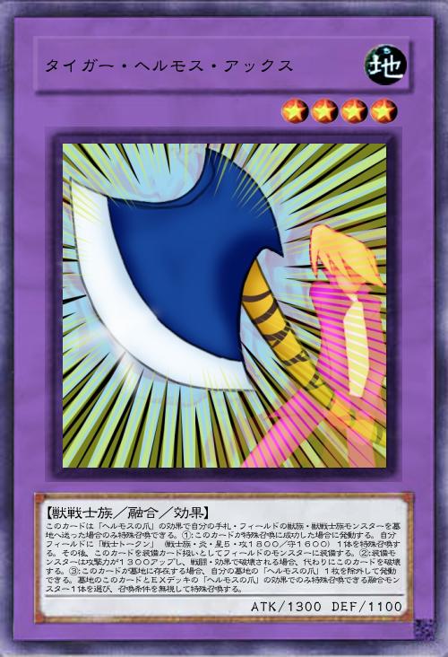 | このカードは「ヘルモスの爪」の効果で自分の手札・フィールドの獣族・獣戦士族モンスターを墓地へ送った場合のみ特殊召喚できる。①:このカードが特殊召喚に成功した場合に発動する。自分フィールドに「戦士トークン」(戦士族・炎・星5・攻1800/守1600)1体を特殊召喚する。その後、このカードを装備カード扱いとしてフィールドのモンスターに装備する。②:装備モンスターは攻撃力が1300アップし、戦闘・効果で破壊される場合、代わりにこのカードを破壊する。③:このカードが墓地に存在する場合、自分の墓地の「ヘルモスの爪」1枚を除外して発動できる。墓地のこのカードとEXデッキの「ヘルモスの爪」の効果でのみ特殊召喚できる融合モンスター1体を選び、召喚条件を無視して特殊召喚する。 | |||