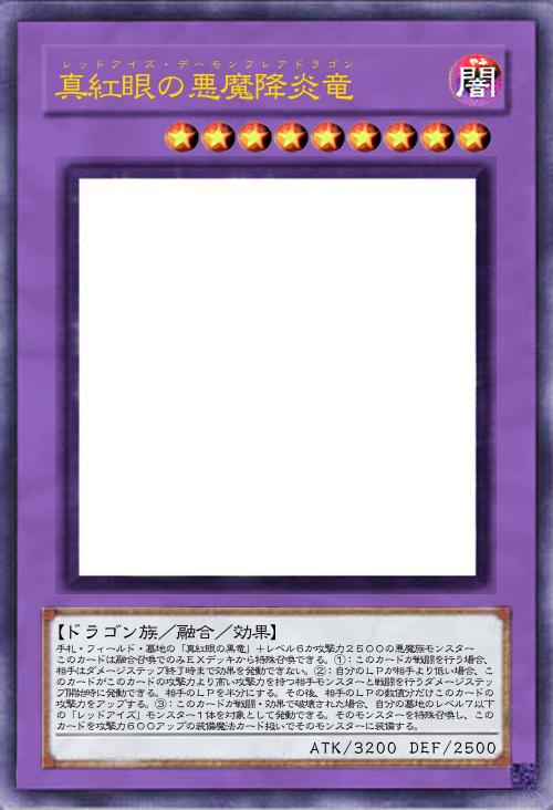 | 手札・フィールド・墓地の「真紅眼の黒竜」+レベル6か攻撃力2500の悪魔族モンスター このカードは融合召喚でのみEXデッキから特殊召喚できる。①:このカードが戦闘を行う場合、相手はダメージステップ終了時まで効果を発動できない。②:自分のLPが相手より低い場合、このカードがこのカードの攻撃力より高い攻撃力を持つ相手モンスターと戦闘を行うダメージステップ開始時に発動できる。相手のLPを半分にする。その後、相手のLPの数値分だけこのカードの攻撃力をアップする。③:このカードが戦闘・効果で破壊された場合、自分の墓地のレベル7以下の「レッドアイズ」モンスター1体を対象として発動できる。そのモンスターを特殊召喚し、このカードを攻撃力600アップの装備魔法カード扱いでそのモンスターに装備する。 | |||