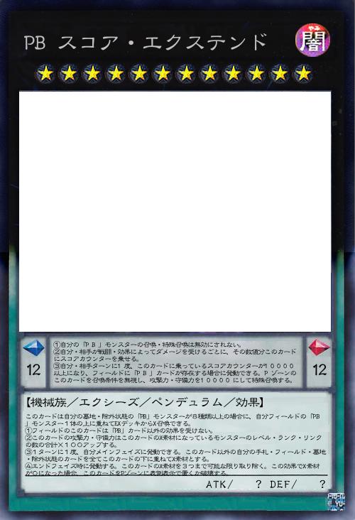 | ①自分の「PB」モンスターの召喚・特殊召喚は無効にされない。 ②自分・相手が戦闘・効果によってダメージを受けるごとに、その数値分このカードにスコアカウンターを乗せる。 ③自分・相手ターンに1度、このカードに乗っているスコアカウンターが10000以上になり、フィールドに「PB」カードが存在する場合に発動できる。Pゾーンのこのカードを召喚条件を無視し、攻撃力・守備力を10000にして特殊召喚する。 | |||