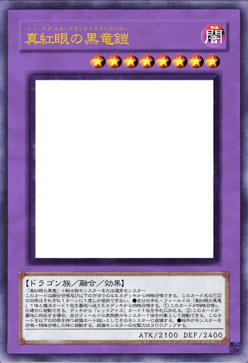 | 「真紅眼の黒竜」+戦士族モンスターまたは通常モンスター このカードは融合召喚及び以下の方法でのみEXデッキから特殊召喚できる。このカード名の①②の効果はそれぞれ1ターンに1度しか使用できない。●自分の手札・フィールドの「真紅眼の黒竜」1体と魔法カード1枚を墓地へ送りEXデッキから特殊召喚する。①:このカードが特殊召喚した場合に発動できる。デッキから「レッドアイズ」カード1枚を手札に加える。②:このカードが墓地に存在する場合、自分フィールドの表側表示モンスター1体を対象として発動できる。このカードを以下の効果を持つ装備カード扱いとしてそのモンスターに装備する。●相手がモンスターを召喚・特殊召喚した時に発動する。装備モンスターの攻撃力は300アップする。 | |||