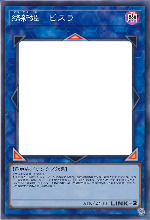 | 昆虫族モンスター2体以上 ①:このカードがモンスターゾーンに存在する限り、相手は捕縛カウンターが置かれたモンスターをリリースできず、融合・S・X・L素材にできない。②:自分・相手ターンに1度、手札またはデッキからレベル6「絡新姫」モンスター1体を墓地へ送って発動できる。この効果は、そのモンスターを除外して発動する効果と同じ効果になる。 | |||