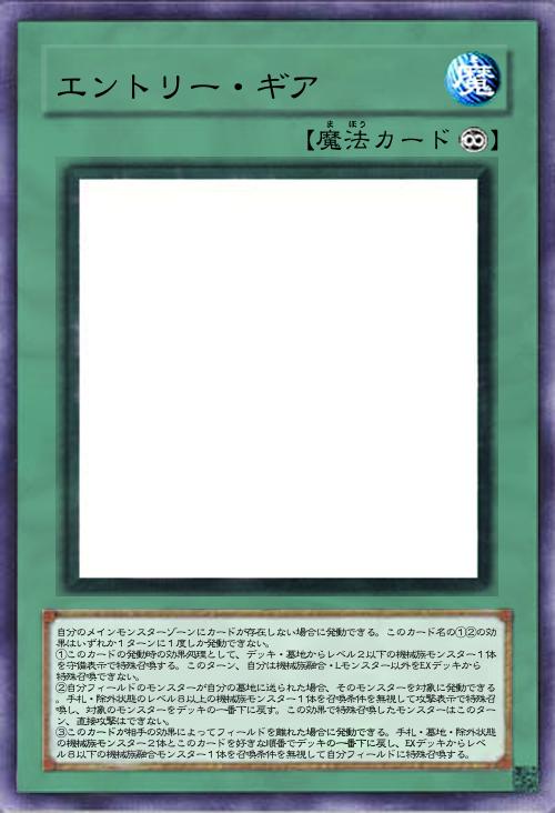 | 自分のメインモンスターゾーンにカードが存在しない場合に発動できる。このカード名の①②の効果はいずれか1ターンに1度しか発動できない。 ①このカードの発動時の効果処理として、デッキ・墓地からレベル2以下の機械族モンスター1体を守備表示で特殊召喚する。このターン、自分は機械族融合・Lモンスター以外をEXデッキから特殊召喚できない。 ②自分フィールドのモンスターが自分の墓地に送られた場合、そのモンスターを対象に発動できる。手札・除外状態のレベル8以上の機械族モンスター1体を召喚条件を無視して攻撃表示で特殊召喚し、対象のモンスターをデッキの一番下に戻す。この効果で特殊召喚したモンスターはこのターン、直接攻撃はできない。 ③このカードが相手の効果によってフィールドを離れた場合に発動できる。手札・墓地・除外状態の機械族モンスター2体とこのカードを好きな順番でデッキの一番下に戻し、EXデッキからレベル8以下の機械族融合モンスター1体を召喚条件を無視して自分フィールドに特殊召喚する。 | |||