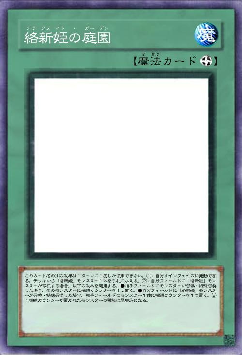 | このカード名の①の効果は1ターンに1度しか使用できない。①:自分メインフェイズに発動できる。デッキから「絡新姫」モンスター1体を手札に加える。②:自分フィールドに「絡新姫」モンスターが存在する場合、以下の効果を適用する。●相手フィールドにモンスターが召喚・特殊召喚した場合、そのモンスターに捕縛カウンターを1つ置く。●自分フィールドに「絡新姫」モンスターが召喚・特殊召喚した場合、相手フィールドのモンスター1体に捕縛カウンターを1つ置く。③:捕縛カウンターが置かれたモンスターの種族は昆虫族になる。 | |||