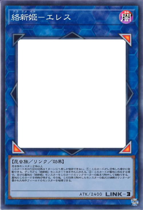 | 昆虫族モンスター2体以上 このカード名の①②の効果は1ターンに1度しか使用できない。①:このカードがL召喚した場合に発動できる。デッキから「絡新姫」モンスター1体を手札に加える。②:このカードが墓地に存在する場合、自分の墓地の「絡新姫」モンスターをこのカードのリンクマーカーの数まで除外して発動できる。墓地のこのカードを特殊召喚する。その後、この効果で除外したモンスターの数だけ捕縛カウンターが置かれた相手フィールドのモンスターを破壊できる。 | |||