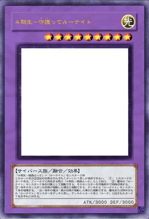 | 「4期生-姫森ルーナ」+「ルーナイト」モンスター2体 このカード名の②③④の効果はそれぞれ1ターンに1度しか使用できない。 ①: このカードのカード名は、フィールドに存在する限り「4期生-姫森ルーナ」として扱う。 ②:墓地の「ルーナイト」モンスター1体を対象として発動できる。そのモンスターを守備表示で特殊召喚する。 ③:相手のモンスターの効果が発動した場合に発動できる。デッキから「ルーナイト」モンスター1体を破壊する。 ④:相手の魔法・罠の効果が発動した場合に発動できる。墓地または除外された「ルーナイト」モンスターをデッキに戻し、デッキからカード名に「ルーナ」と記されたカード1枚を手札に加える。 | |||