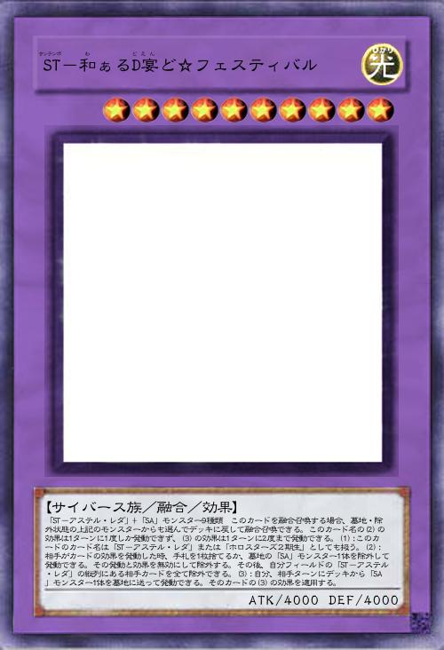 | 「ST-アステル・レダ」+「SA」モンスター9種類 このカードを融合召喚する場合、墓地・除外状態の上記のモンスターからも選んでデッキに戻して融合召喚できる。このカード名の(2)の効果は1ターンに1度しか発動できず、(3)の効果は1ターンに2度まで発動できる。(1):このカードのカード名は「ST-アステル・レダ」または「ホロスターズ2期生」としても扱う。(2):相手がカードの効果を発動した時、手札を1枚捨てるか、墓地の「SA」モンスター1体を除外して発動できる。その発動と効果を無効にして除外する。その後、自分フィールドの「ST-アステル・レダ」の縦列にある相手カードを全て除外できる。(3):自分、相手ターンにデッキから「SA」モンスター1体を墓地に送って発動できる。そのカードの(3)の効果を適用する。 | |||