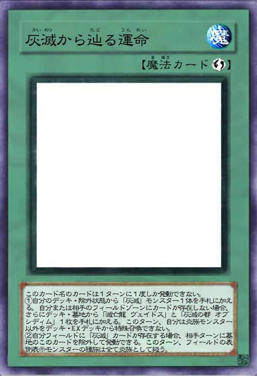 | このカード名のカードは1ターンに1度しか発動できない。 ①自分のデッキ・除外状態から「灰滅」モンスター1体を手札に加える。自分または相手のフィールドゾーンにカードが存在しない場合、さらにデッキ・墓地から「滅亡龍 ヴェイドス」と「灰滅の都 オブシディム」1枚を手札に加える。このターン、自分は炎族モンスター以外をデッキ・EXデッキから特殊召喚できない。 ②自分フィールドに「灰滅」カードが存在する場合、相手ターンに墓地のこのカードを除外して発動できる。このターン、フィールドの表側表示モンスターの種族は全て炎族として扱う。 | |||