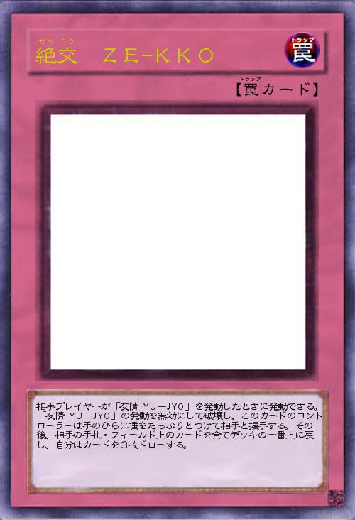 相手プレイヤーが「友情 YU-JYO」を発動したときに発動できる。「友情 YU-JYO」の発動を無効にして破壊し、このカードのコントローラーは手のひらに唾をたっぷりとつけて相手と握手する。その後、相手の手札・フィールド上のカードを全てデッキの一番上に戻し、自分はカードを3枚ドローする。 |