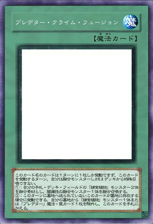 | このカード名のカードは1ターンに1枚しか発動できず、このカードを発動するターン、自分は融合モンスターしかEXデッキから特殊召喚できない。 ①:自分の手札・デッキ・フィールドの「捕食植物」モンスター2体を融合素材とし、闇属性の融合モンスター1体を融合召喚する。 ②:このターンに墓地へ送られていないこのカードが墓地に存在する場合に発動できる、自分の墓地から「捕食植物」モンスター1体または「プレデター」魔法・罠カード1枚を除外し、このカードを手札に加える。 | |||