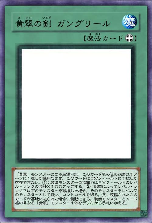 | 「黄翠」モンスターにのみ装備可能。このカード名の③の効果は1ターンに1度しか使用できず、このカードは自分フィールドに1枚しか存在できない。①:装備モンスターの攻撃力は自分フィールドのレベル・ランクの合計×100アップする。②:戦闘によってレベル・ランク7以下のモンスターを破壊した場合、そのモンスターをレベル7のモンスターとして扱い、コントロールを得る。③:装備されたこのカードが墓地に送られた場合に発動できる。装備モンスターとカード名の異なる「黄翠」モンスター1体をデッキから手札に加える。 | |||