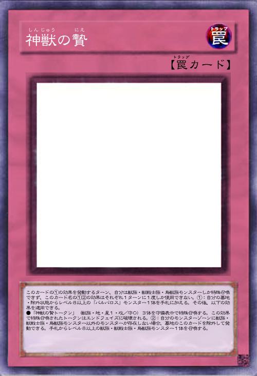 | このカードの①の効果を発動するターン、自分は獣族・獣戦士族・鳥獣族モンスターしか特殊召喚できず、このカード名の①②の効果はそれぞれ1ターンに1度しか使用できない。①:自分の墓地・除外状態からレベル8以上の「バルバロス」モンスター1体を手札に加える。その後、以下の効果を適用できる。 ●「神獣の贄トークン」(獣族・地・星1・攻/守0)3体を守備表示で特殊召喚する。この効果で特殊召喚されたトークンはエンドフェイズに破壊される。②:自分のモンスターゾーンに獣族・獣戦士族・鳥獣族モンスター以外のモンスターが存在しない場合、墓地のこのカードを除外して発動できる。手札からレベル8以上の獣族・獣戦士族・鳥獣族モンスター1体を召喚する。 | |||