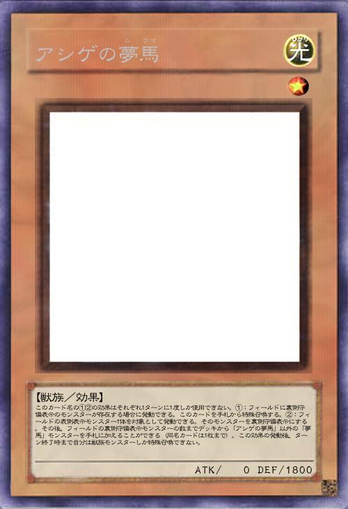 | このカード名の①②の効果はそれぞれ1ターンに1度しか使用できない。①:フィールドに裏側守備表示のモンスターが存在する場合に発動できる。このカードを手札から特殊召喚する。②:フィールドの表側表示モンスター1体を対象として発動できる。そのモンスターを裏側守備表示にする。その後、フィールドの裏側守備表示モンスターの数までデッキから「アシゲの夢馬」以外の「夢馬」モンスターを手札に加えることができる(同名カードは1枚まで)。この効果の発動後、ターン終了時まで自分は獣族モンスターしか特殊召喚できない。 | |||