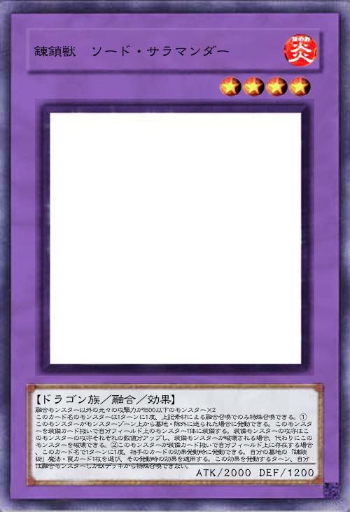 | 融合モンスター以外の元々の攻撃力が1500以下のモンスター×2 このカード名のモンスターは1ターンに1度、上記素材による融合召喚でのみ特殊召喚できる。①このモンスターがモンスターゾーン上から墓地・除外に送られた場合に発動できる。このモンスターを装備カード扱いで自分フィールド上のモンスター1体に装備する。装備モンスターの攻守はこのモンスターの攻守それぞれの数値分アップし、装備モンスターが破壊される場合、代わりにこのモンスターを破壊できる。②このモンスターが装備カード扱いで自分フィールド上に存在する場合、このカード名で1ターンに1度、相手のカードの効果発動時に発動できる。自分の墓地の「錬鎖術」魔法・罠カード1枚を選び、その発動時の効果を適用する。この効果を発動するターン、自分は融合モンスターしかEXデッキから特殊召喚できない。 | |||