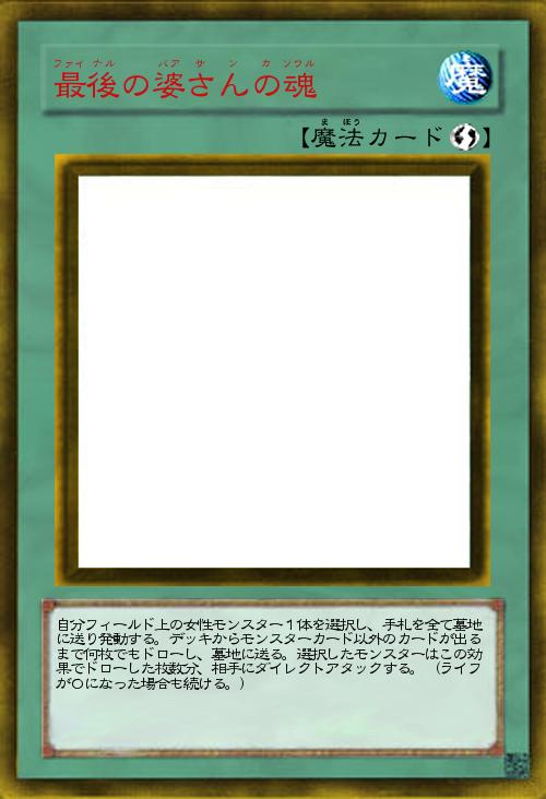 | 自分フィールド上の女性モンスター1体を選択し、手札を全て墓地に送り発動する。デッキからモンスターカード以外のカードが出るまで何枚でもドローし、墓地に送る。選択したモンスターはこの効果でドローした枚数分、相手にダイレクトアタックする。(ライフが0になった場合も続ける。) | |||