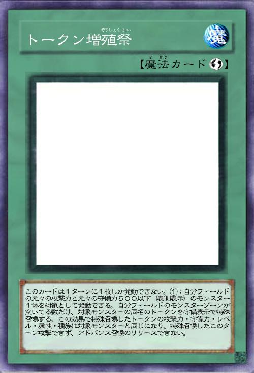 | このカードは1ターンに1枚しか発動できない。①:自分フィールドの元々の攻撃力と元々の守備力500以下(表側表示)のモンスター1体を対象として発動できる。自分フィールドのモンスターゾーンが空いてる数だけ、対象モンスターの同名のトークンを守備表示で特殊召喚する。この効果で特殊召喚したトークンの攻撃力・守備力・レベル・属性・種族は対象モンスターと同じになり、特殊召喚したこのターン攻撃できず、アドバンス召喚のリリースできない。 | |||