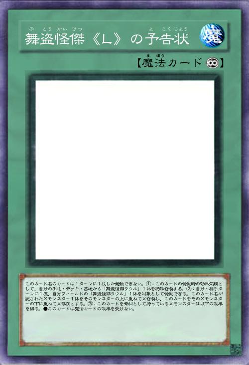 | このカード名のカードは1ターンに1枚しか発動できない。①:このカードの発動時の効果処理として、自分の手札・デッキ・墓地から「舞盗怪傑ラウル」1体を特殊召喚する。②:自分・相手ターンに1度、自分フィールドの「舞盗怪傑ラウル」1体を対象として発動できる。このカード名が記されたXモンスター1体をそのモンスターの上に重ねてX召喚し、このカードをそのXモンスターの下に重ねてX存在とする。③:このカードを素材として持っているXモンスターは以下の効果を得る。●このカードは魔法カードの効果を受けない。 | |||