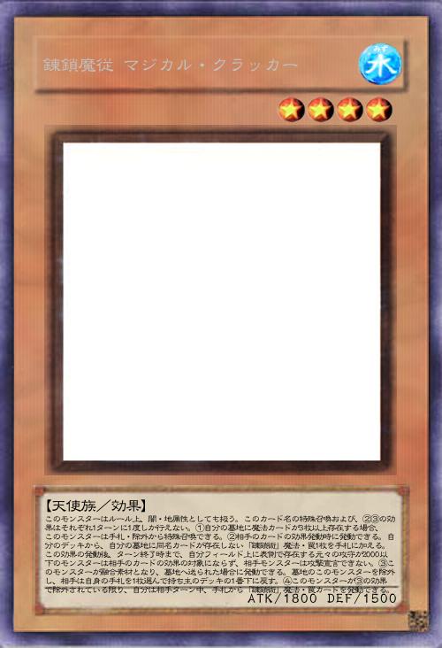 | このモンスターはルール上、闇・地属性としても扱う。このカード名の特殊召喚および、②③の効果はそれぞれ1ターンに1度しか行えない。①自分の墓地に魔法カードが3枚以上存在する場合、このモンスターは手札・除外から特殊召喚できる。②相手のカードの効果発動時に発動できる。自分のデッキから、自分の墓地に同名カードが存在しない「錬鎖術」魔法・罠1枚を手札に加える。この効果の発動後、ターン終了時まで、自分フィールド上に表側で存在する元々の攻守が2000以下のモンスターは相手のカードの効果の対象にならず、相手モンスターは攻撃宣言できない。③このモンスターが融合素材となり、墓地へ送られた場合に発動できる。墓地のこのモンスターを除外し、相手は自身の手札を1枚選んで持ち主のデッキの1番下に戻す。④このモンスターが③の効果で除外されている限り、自分は相手ターン中、手札から「錬鎖術」魔法・罠カードを発動できる。 | |||