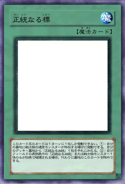 | このカード名のカードは1ターンに1枚しか発動できない。①:自分の墓地に戦士族の通常モンスターが存在する場合に発動できる。自分のデッキ・墓地から「正統なる血統」1枚を手札に加える。②:自分フィールドの表側表示の「正統なる血統」または戦士族モンスター1体のみが効果で破壊される場合、代わりに墓地のこのカードを除外できる。 | |||