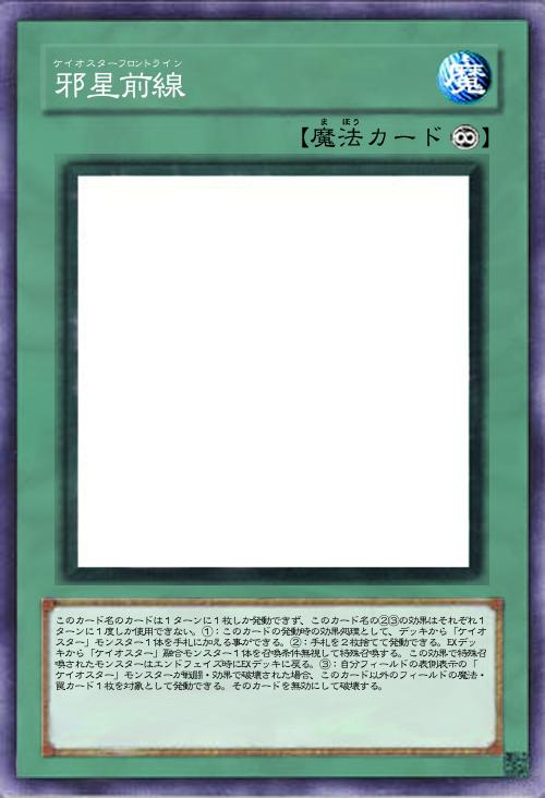 | このカード名のカードは1ターンに1枚しか発動できず、このカード名の②③の効果はそれぞれ1ターンに1度しか使用できない。①:このカードの発動時の効果処理として、デッキから「ケイオスター」モンスター1体を手札に加える事ができる。②:手札を2枚捨てて発動できる。EXデッキから「ケイオスター」融合モンスター1体を召喚条件無視して特殊召喚する。この効果で特殊召喚されたモンスターはエンドフェイズ時にEXデッキに戻る。③:自分フィールドの表側表示の「ケイオスター」モンスターが戦闘・効果で破壊された場合、このカード以外のフィールドの魔法・罠カード1枚を対象として発動できる。そのカードを無効にして破壊する。 | |||