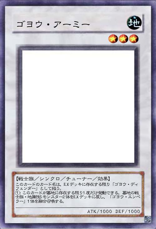 | このカードのカード名は、EXデッキに存在する限り「ゴヨウ・ディフェンダー」として扱う。 ①:このカードが墓地に存在する限り1度だけ発動できる。墓地の戦士族・地属性Sモンスター2体をEXデッキに戻し、「ゴヨウ・エンペラー」1体を融合召喚する。 | |||