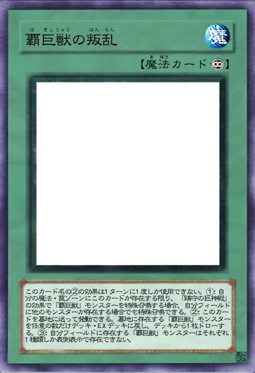 | このカード名の②の効果は1ターンに1度しか使用できない。①:自分の魔法・罠ゾーンにこのカードが存在する限り、「鎮守の巨神殿」 の効果で「覇巨獣」モンスターを特殊召喚する場合、自分フィールドに他のモンスターが存在する場合でも特殊召喚できる。②:このカードを墓地に送って発動できる。墓地に存在する「覇巨獣」モンスターを任意の数だけデッキ・EXデッキに戻し、デッキから1枚ドローする。③:自分フィールドに存在する「覇巨獣」モンスターはそれぞれ1種類しか表側表示で存在できない。 | |||