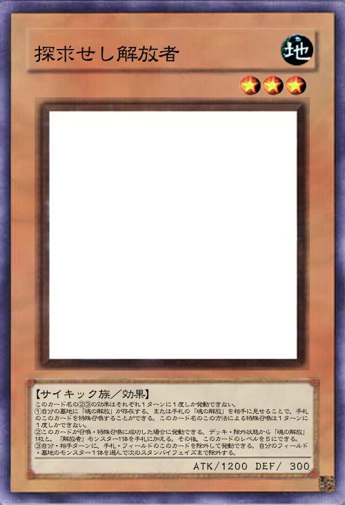 | このカード名の②③の効果はそれぞれ1ターンに1度しか発動できない。 ①自分の墓地に「魂の解放」が存在する、または手札の「魂の解放」を相手に見せることで、手札のこのカードを特殊召喚することができる。このカード名のこの方法による特殊召喚は1ターンに1度しかできない。 ②このカードが召喚・特殊召喚に成功した場合に発動できる。デッキ・除外状態から「魂の解放」1枚と、「解放者」モンスター1体を手札に加える。その後、このカードのレベルを5にできる。 ③自分・相手ターンに、手札・フィールドのこのカードを除外して発動できる。自分のフィールド・墓地のモンスター1体を選んで次のスタンバイフェイズまで除外する。 | |||