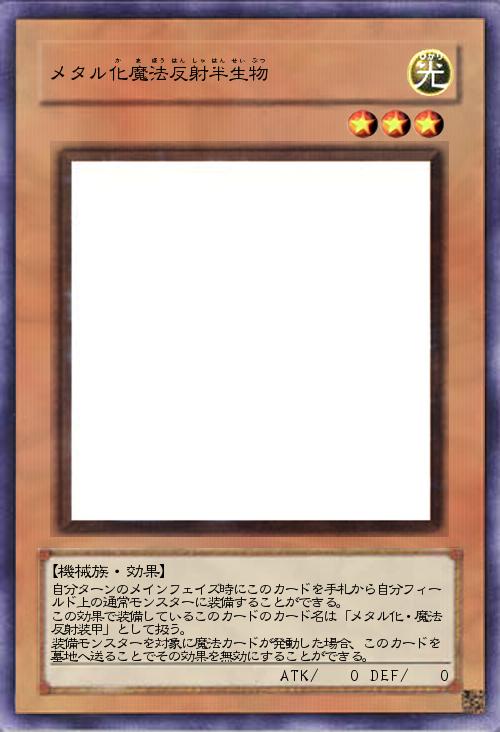 自分ターンのメインフェイズ時にこのカードを手札から自分フィールド上の通常モンスターに装備することができる。 この効果で装備しているこのカードのカード名は「メタル化・魔法反射装甲」として扱う。 装備モンスターを対象に魔法カードが発動した場合、このカードを墓地へ送ることでその効果を無効にすることができる。 |