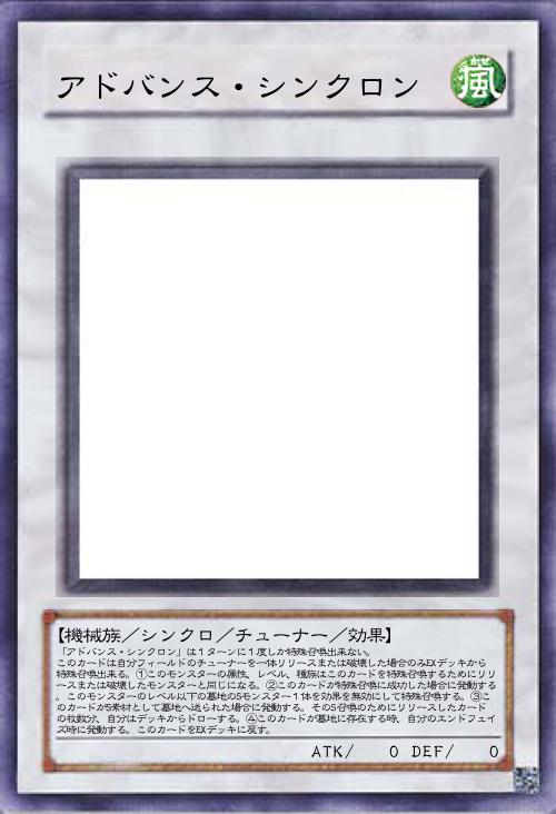 | 「アドバンス・シンクロン」は1ターンに1度しか特殊召喚出来ない。 このカードは自分フィールドのチューナーを一体リリースまたは破壊した場合のみEXデッキから特殊召喚出来る。①このモンスターの属性、レベル、種族はこのカードを特殊召喚するためにリリースまたは破壊したモンスターと同じになる。②このカードが特殊召喚に成功した場合に発動する。このモンスターのレベル以下の墓地のSモンスター1体を効果を無効にして特殊召喚する。③このカードがS素材として墓地へ送られた場合に発動する。そのS召喚のためにリリースしたカードの枚数分、自分はデッキからドローする。④このカードが墓地に存在する時、自分のエンドフェイズ時に発動する。このカードをEXデッキに戻す。 | |||