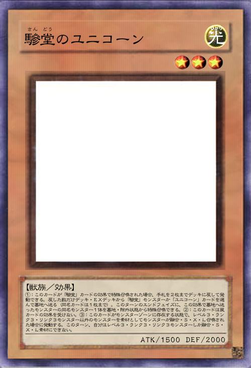 | ①:このカードが「驂堂」カードの効果で特殊召喚された場合、手札を2枚までデッキに戻して発動できる。戻した数だけデッキ・EXデッキから「驂堂」モンスターか「ユニコーン」カードを選んで墓地へ送る(同名カードは1枚まで)。このターンのエンドフェイズに、この効果で墓地へ送ったモンスターの同名モンスター1体を墓地・除外状態から特殊召喚できる。②:このカードは罠カードの効果を受けない。③:このカードがモンスターゾーンに存在する状態で、レベル3・ランク3・リンク3モンスター以外のモンスターを素材としてモンスターが融合・S・X・L召喚された場合に発動する。このターン、自分はレベル3・ランク3・リンク3モンスターしか融合・S・X・L素材にできない。 | |||