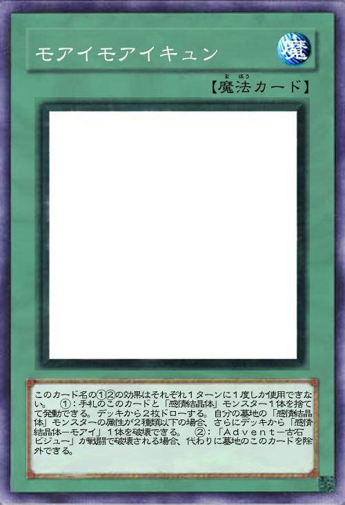 | このカード名の①②の効果はそれぞれ1ターンに1度しか使用できない。 ①:手札のこのカードと「感情結晶体」モンスター1体を捨てて発動できる。デッキから2枚ドローする。自分の墓地の「感情結晶体」モンスターの属性が2種類以下の場合、さらにデッキから「感情結晶体-モアイ」1体を破壊できる。 ②:「Advent-古石 ビジュー」が戦闘で破壊される場合、代わりに墓地のこのカードを除外できる。 | |||