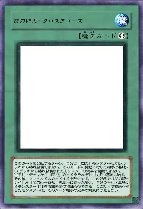 | このカードを発動するターン、自分は「閃刀」モンスターしかEXデッキから特殊召喚できない。このカードの発動に対して相手は墓地・EXデッキから特殊召喚されたモンスターの効果を発動できない。 ①手札・デッキから「閃刀」カードをそれぞれ1枚ずつ墓地に送る。その後、フィールドのカード1枚を除外する。この効果で「閃刀姫ーレイ」か「閃刀姫ーロゼ」を墓地に送った場合、自分の手札・墓地からモンスター1体を攻撃表示で特殊召喚できる。この効果で特殊召喚したモンスターは、このターン相手の効果の対象にはならない。 | |||