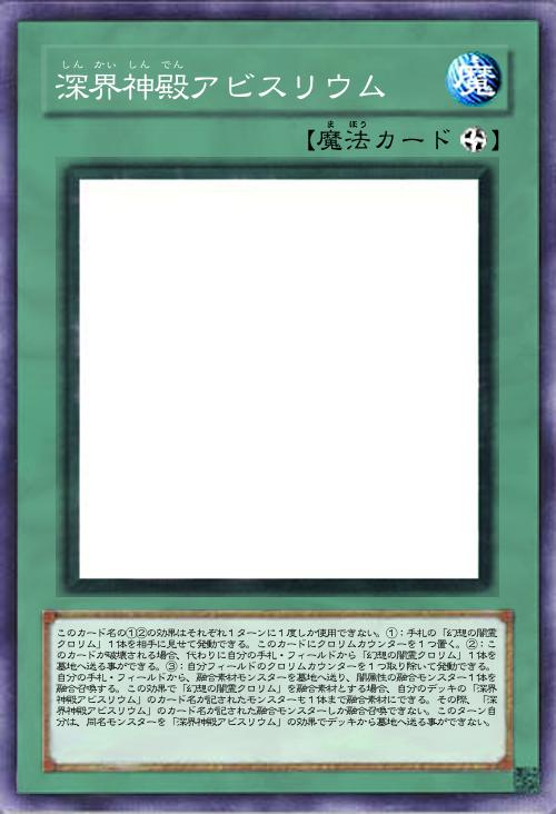 | このカード名の①②の効果はそれぞれ1ターンに1度しか使用できない。①:手札の「幻想の闇霊クロリム」1体を相手に見せて発動できる。このカードにクロリムカウンターを1つ置く。②:このカードが破壊される場合、代わりに自分の手札・フィールドから「幻想の闇霊クロリム」1体を墓地へ送る事ができる。③:自分フィールドのクロリムカウンターを1つ取り除いて発動できる。自分の手札・フィールドから、融合素材モンスターを墓地へ送り、闇属性の融合モンスター1体を融合召喚する。この効果で「幻想の闇霊クロリム」を融合素材とする場合、自分のデッキの「深界神殿アビスリウム」のカード名が記されたモンスターも1体まで融合素材にできる。その際、「深界神殿アビスリウム」のカード名が記された融合モンスターしか融合召喚できない。このターン自分は、同名モンスターを「深界神殿アビスリウム」の効果でデッキから墓地へ送る事ができない。 | |||
