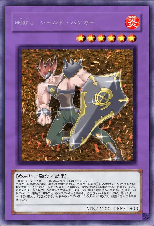 | 「HERO's ファイター」+岩石族以外の「HERO'sモンスター」 このカードは融合召喚でしか特殊召喚できない。このカード名の②の効果は1ターンに1度しか発動できない。①:このカードがモンスターと戦闘を行う攻撃宣言時に発動できる。戦闘を行う互いのモンスターのそれぞれの攻撃力と守備力を、ダメージ計算終了時まで入れ替える。②:自分・相手ターンに、墓地の「HERO's」モンスター1体を除外し、自分フィールドの「HERO」モンスター1体を対象として発動できる。対象のモンスターは、このターン1度だけ、戦闘・効果では破壊されない。 | |||