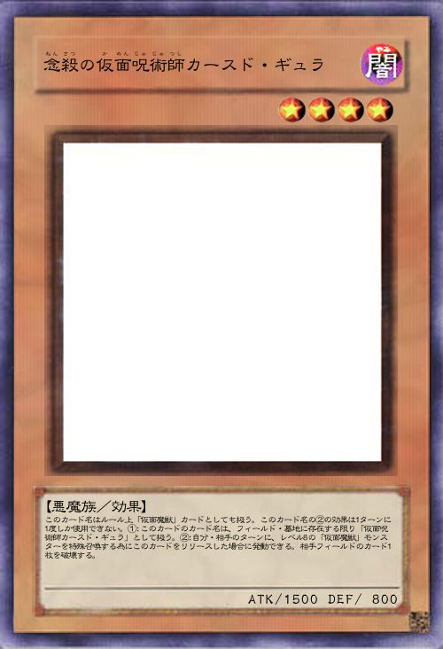 | このカード名はルール上「仮面魔獣」カードとしても扱う。このカード名の②の効果は1ターンに1度しか使用できない。①:このカードのカード名は、フィールド・墓地に存在する限り「仮面呪術師カースド・ギュラ」として扱う。②:自分・相手のターンに、レベル8の「仮面魔獣」モンスターを特殊召喚する為にこのカードをリリースした場合に発動できる。相手フィールドのカード1枚を破壊する。 | |||