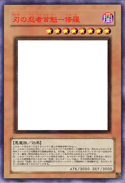 | このカード名のカードは1ターンに1度しか特殊召喚できない。 ①:このカード以外の手札・フィールドのカード1枚を除外して発動できる。手札のこのカードを相手フィールドに攻撃表示で特殊召喚する。その後、このカードの元々のコントローラーは自分のデッキ・墓地・除外状態のスピリットモンスター1体を手札に加えることができる。 ②:このカードがモンスターゾーンに存在する限り、元々のカード名に「忍者」を含まない自分フィールドの表側表示モンスターは「忍者」モンスターとして扱い、その効果は無効化される。 ③:自分の「忍者」モンスターが戦闘を行うダメージステップ開始時に1度発動する。そのモンスターの攻撃力を1000アップする。 | |||
