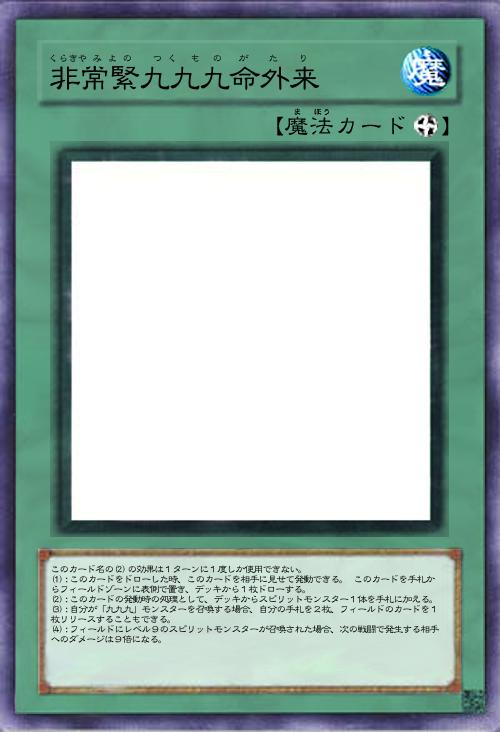 | このカード名の(2)の効果は1ターンに1度しか使用できない。 (1):このカードをドローした時、このカードを相手に見せて発動できる。 このカードを手札からフィールドゾーンに表側で置き、デッキから1枚ドローする。 (2):このカードの発動時の処理として、デッキからスピリットモンスター1体を手札に加える。 (3):自分が「九九九」モンスターを召喚する場合、自分の手札を2枚、フィールドのカードを1枚リリースすることもできる。 (4):フィールドにレベル9のスピリットモンスターが召喚された場合、次の戦闘で発生する相手へのダメージは9倍になる。 | |||